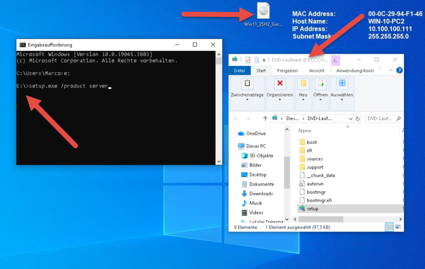 In meinem Fall wurde die Windows 11 ISO Datei als Laufwerk E: eingebunden, wir wechseln also mit E: in der Kommandozeile auf Laufwerk E und starten das Setup mit dem Befehl: „setup.exe /product server“
