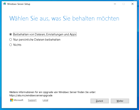 Starten wir an dieser Stelle mal mit einem In-Place Upgrade und behalten alle Dateien und Programme. Der PC in diesem Fall (in dieser Demo eine virtuelle Umgebung) erfüllt die Mindestanforderungen nicht, dies umgehen wir folgendermaßen:
